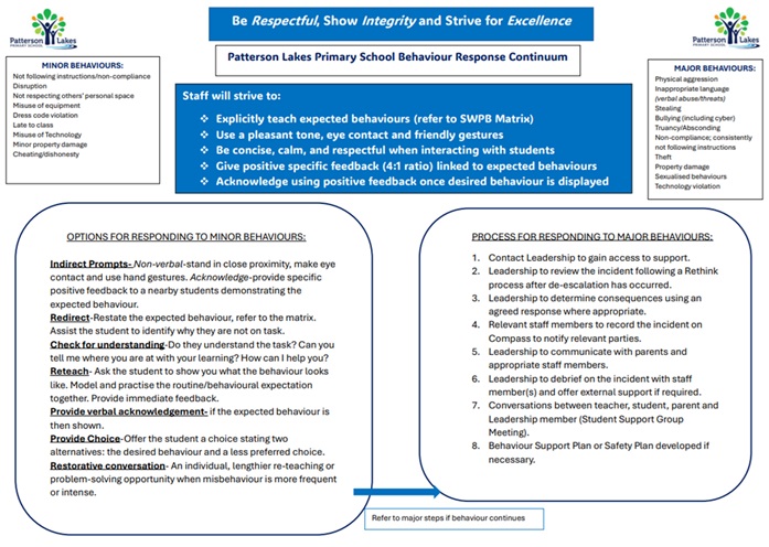 The Behaviour Response Continuum is our school’s way of supporting and guiding student behaviour. It gives a clear and consistent approach for teaching expected behaviours, recognising positive choices, and providing support when students need it. Staff respond to behaviour mistakes the same way they respond to learning